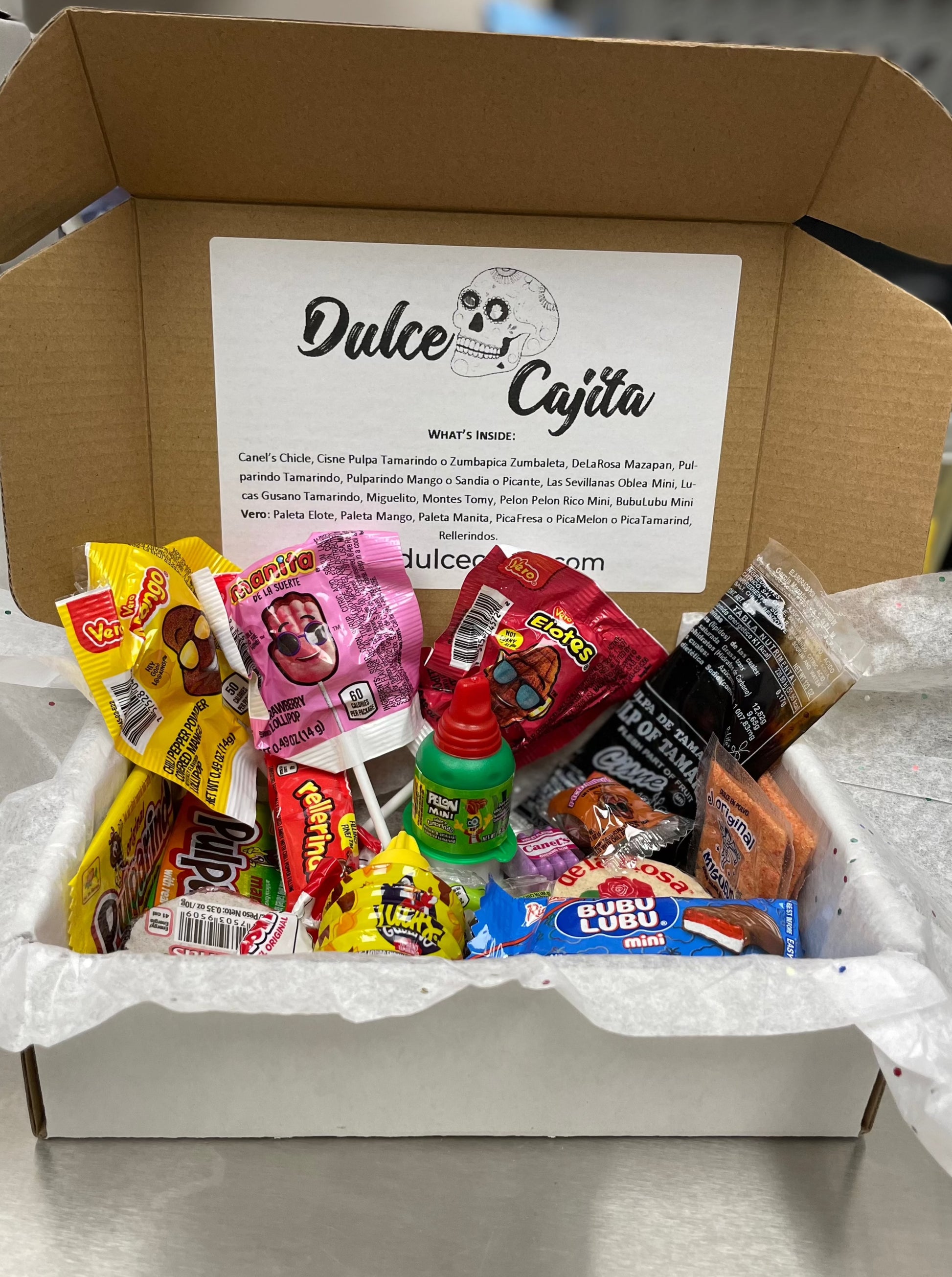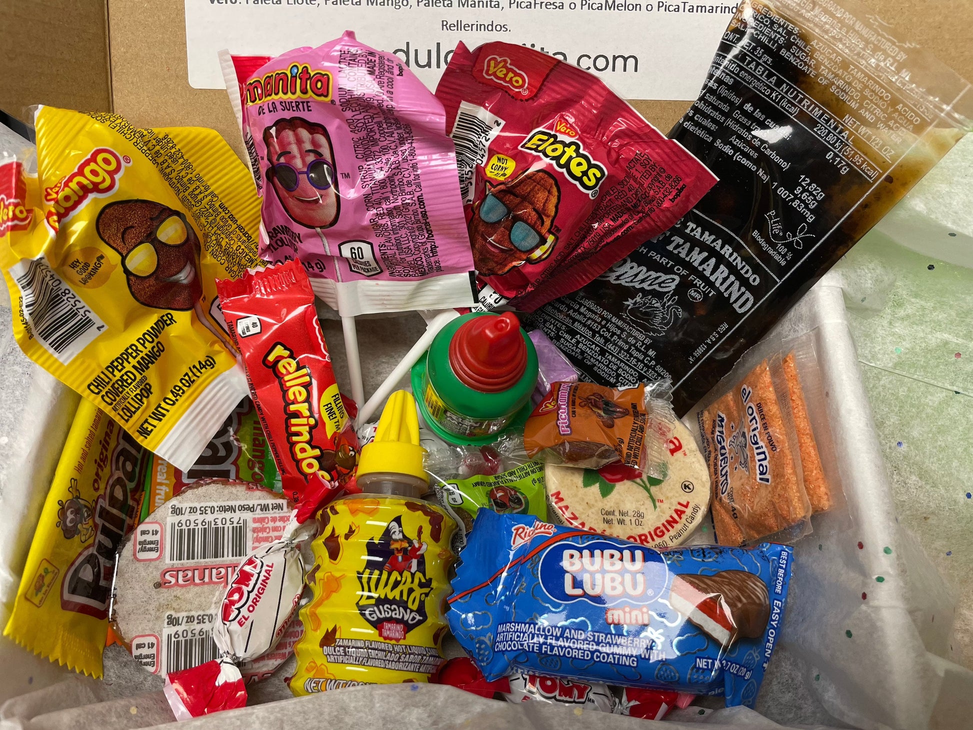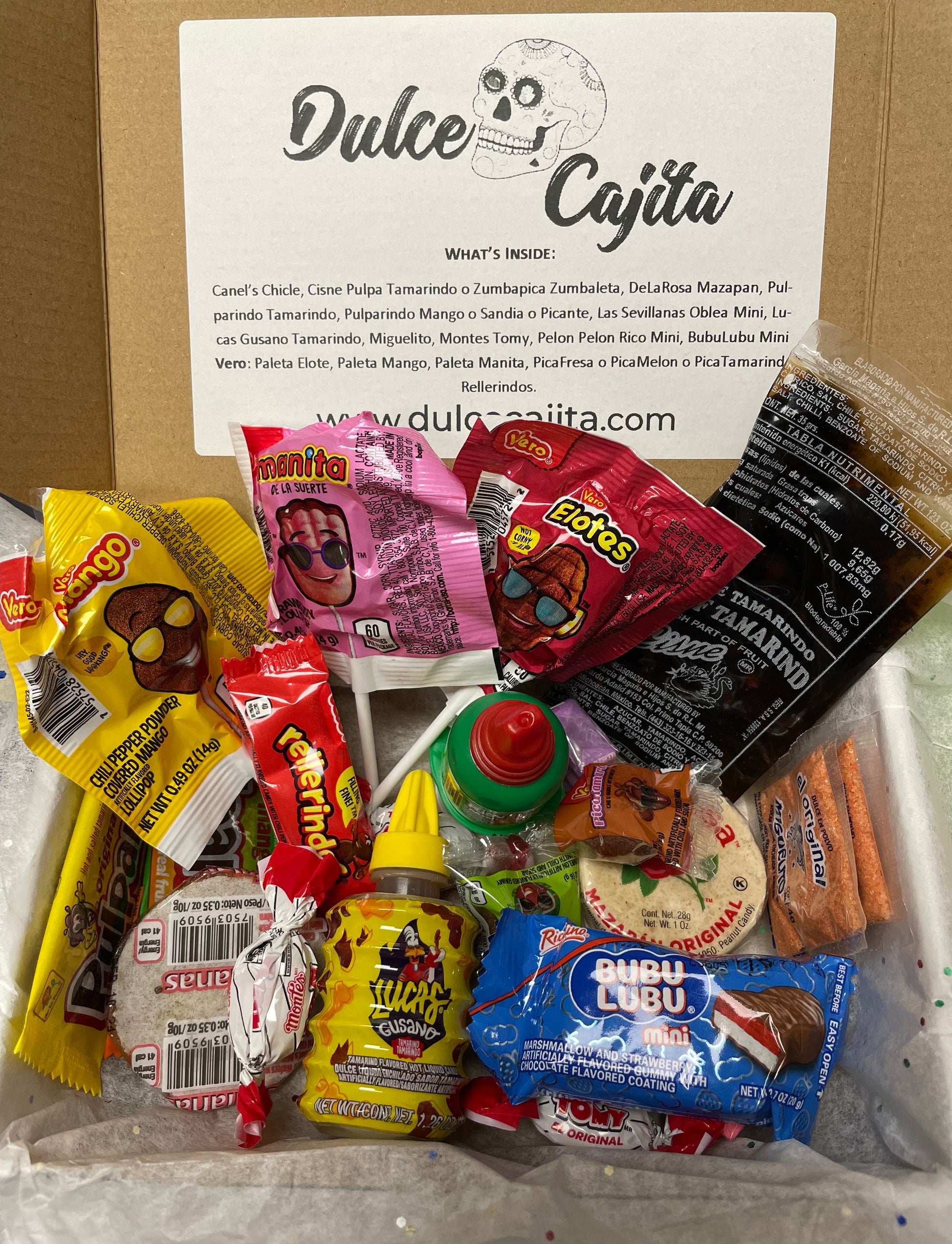 Includes / Incluye: Canel’s Chicle, Cisne Pulpa Tamarindo o Zumbapica Zumbaleta, DeLaRosa Mazapan, Pulparindo Tamarindo, Pulparindo Mango o Sandia o Picante, Las Sevillanas Oblea Mini, Lucas Gusano Tamarindo, Miguelito, Montes Tomy, Pelon Pelon Rico Mini, BubuLubu Mini Vero: Paleta Elote, Paleta Mango, Paleta Manita, PicaFresa o PicaMelon o PicaTamarind, Rellerindos.